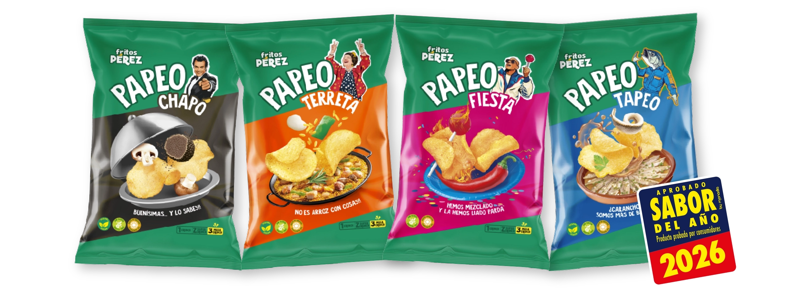 La gama ‘Papeo’ se compone del sabor ‘Chapó’, un acierto seguro para los más clásicos; ‘Terreta’, algo más que arroz con cosas; ‘Fiesta’, una combinación sorprendente para los consumidores más arriesgados y ‘Tapeo’ para los amantes de una buena tapa española. Un lanzamiento que se apropia de las motivaciones del consumidor de snacks y aperitivos, placer y sabor, con el objetivo de dinamizar el lineal de patatas fritas y motivar su consumo en las franjas de edad donde decrece.